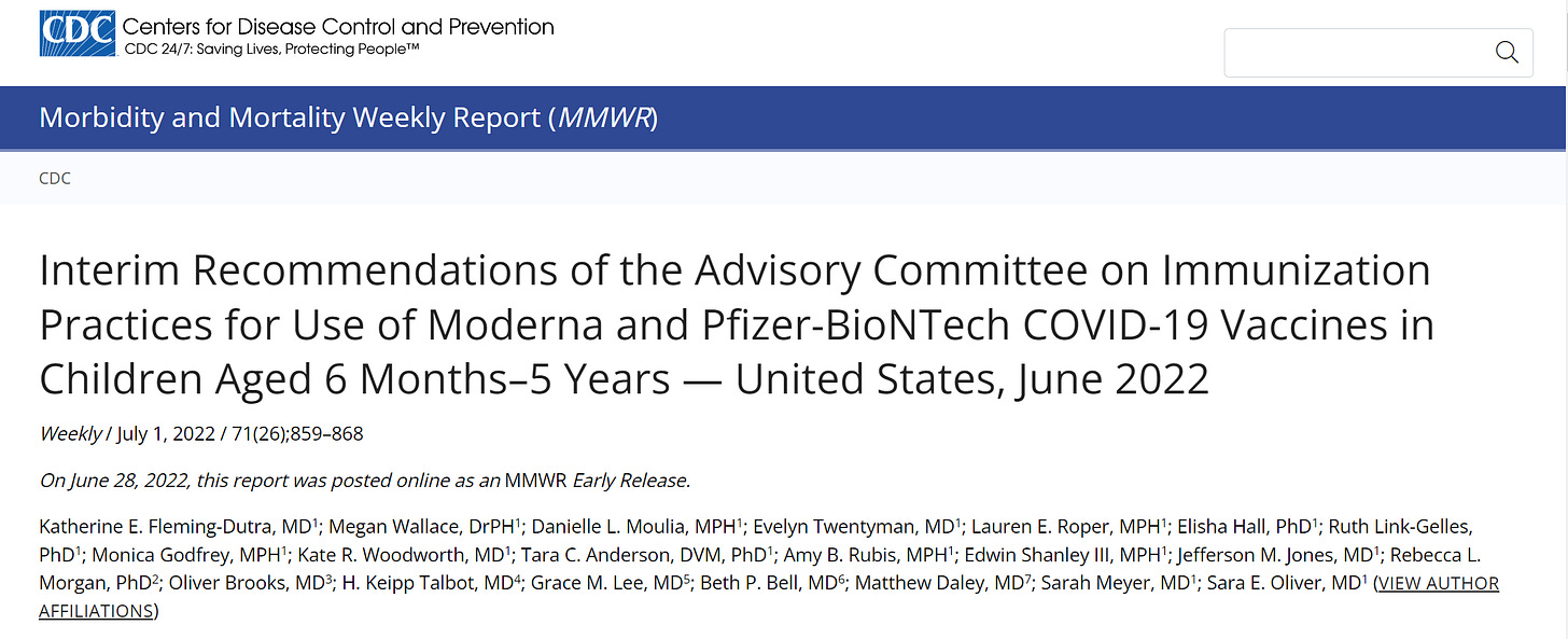 เขาไปตีพิมพิ์ในนี้ครับ “Interim Recommendations of the Advisory Committee on Immunization Practices for Use of Moderna and Pfizer-BioNTech COVID-19 Vaccines in Children Aged 6 Months-5 Years - United States, June 2022” ในวารสาร Morbidity and Mortality Weekly Report ซึ่งเป็นวารสารของกระทรวงสาธารณสุขของสหรัฐ เป็นรายงานที่สนับสนุนทั้ง Pfizer และ Moderna ในเด็กไปด้วยกัน ทั้งๆที่ปกติแล้ว จะเป็นเรื่องของบริษัทยาที่ต้องทำวิจัยเอง ที่น่าสนใจคือ ผู้วิจัยหลักทั้งสองคน (ชื่อแรก และชื่อสุดท้าย) คือ Katherine E. Fleming-Dutra และ Sara E. Oliver ทำงานใน COVID-19 Vaccine Policy Unit, National Center for Immunization and Respiratory Diseases, CDC ซึ่งเป็นหน่วยงานรัฐ ที่กำหนดนโยบาย ไม่ใช่ทำหน้าที่สแตมป์รับรองความปลอดภัยให้บริษัทยา เขาอ้างว่า เขาทำแบบไม่มีผลประโยชน์ทับซ้อน แต่เป็นที่รู้กันว่า งานวิจัยนี้ ไฟเซอร์กับไบโอเอนเทคให้ทุนทำ และเป็นเรื่องปกติที่ คนที่ทำงานกับ CDC พอหมอสัญญาจ้างก็จะย้ายไปกินตำแหน่งใหญ่ในบริษัทยา เอาครับแค่ตั้งข้อสงสัย แต่เราไปดูกันจริงๆว่า เขาวิจัยอะไรกัน?