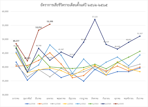 เดือนเมษาที่ผ่านมาคนไทยตาย 55,398 ราย รวมตั้งแต่ต้นปี มค ถึง เมษา 2565 คนไทยตายทั้งสิ้น 199,226 ราย มากกว่าในปี 2564 ที่ตายทั้งสิ้น 174,096 ถึง 25,130 ราย หรือ เพิ่มขึ้น 12.6 % ในจำนวนนี้ตาย กับ/จาก โควิด 6,844 ราย แปลว่า หากไม่นับที่ตายจากโควิด คนไทยตายเพิ่มขึ้น 9% หรือ 18,286 ราย ในช่วงเวลาสี่เดือนที่ผ่านมาเมื่อเทียบกับช่วงเวลาเดียวกันของปี 2564 อะไรทำให้คนไทยตายเพิ่มขึ้น ?
