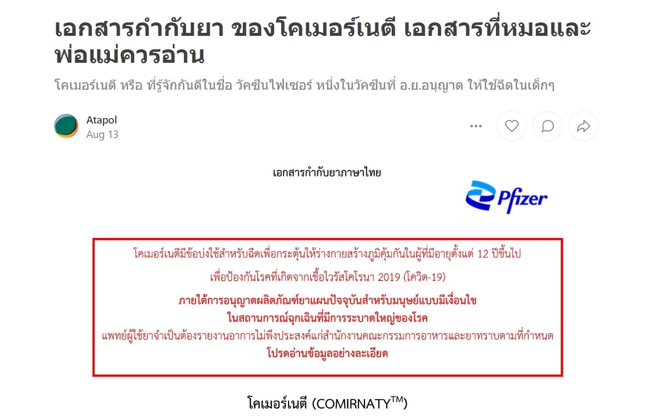 ผลจากการกดดันของเราให้เปิดเผยใบกำกับยา ฝาแดง ไฟเซอร์ ที่ฉีดในเด็กเล็กครับ อย เอามาโพสต์ละ ลองเข้าไปอ่านดูจะเห็นว่า เอกสารเป็น ของยาฉีดสำหรับ เด็กหกเดือน ถึงสี่ปี แต่ในนั้นกลับเต็มไปด้วยข้อมูลของ เด็กโตกับผู้ใหญ่ มีข้อมูลของเด็กเล็กน้อยมาก ทำไม เพราะว่า จริงๆแล้วงานวิจัยที่ใช้ขออนุญาตในเด็กเล็กนั้น ล้มเหลว ยังไงนั้นตามอ่านได้ใน โพสต์นี้ครับ